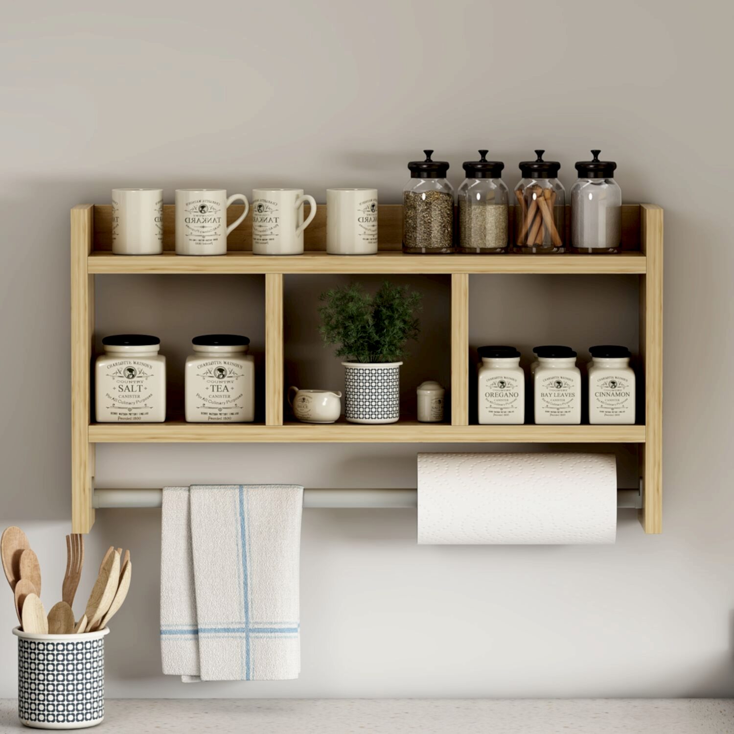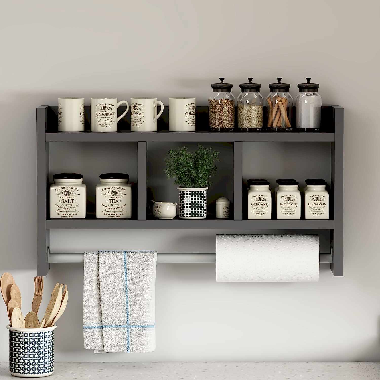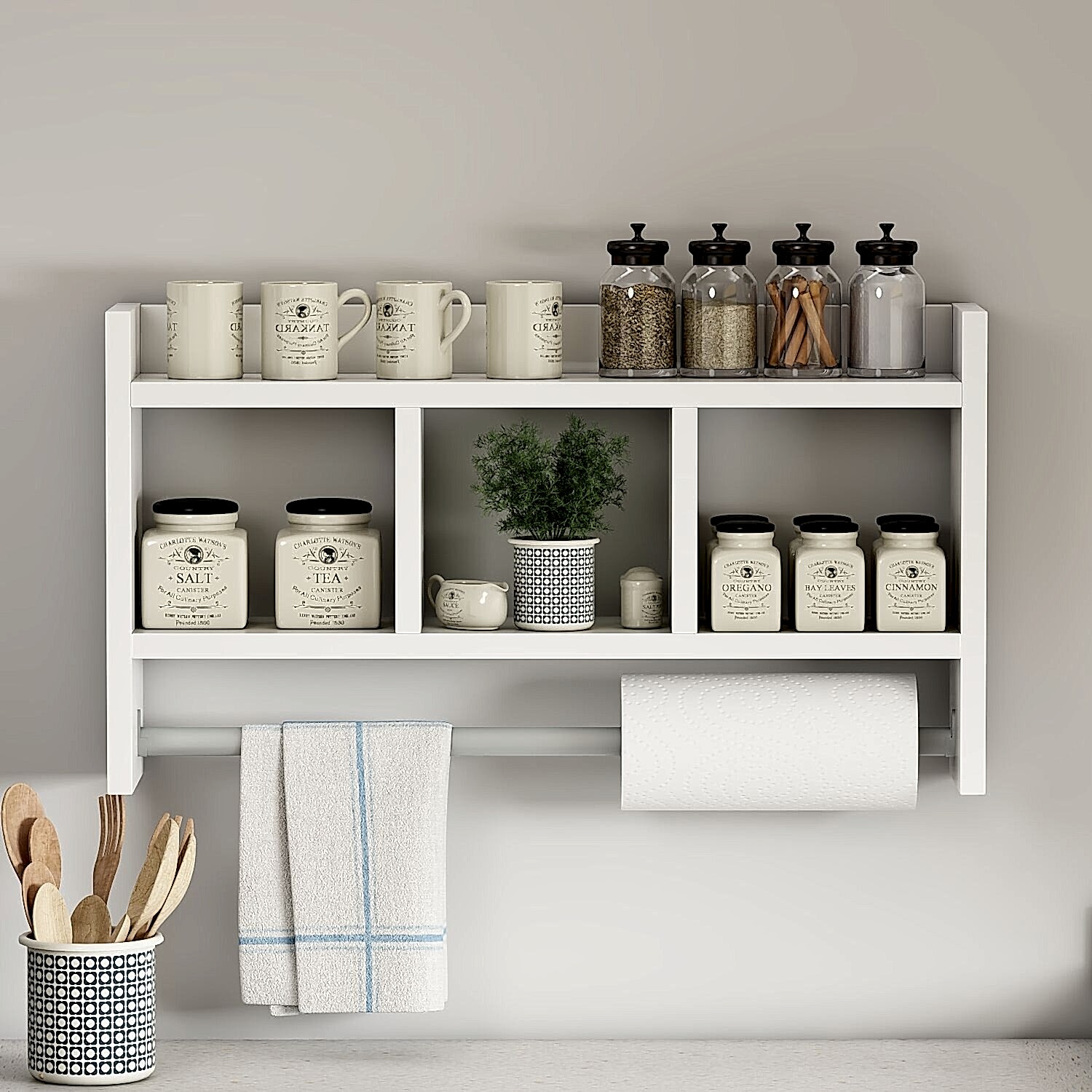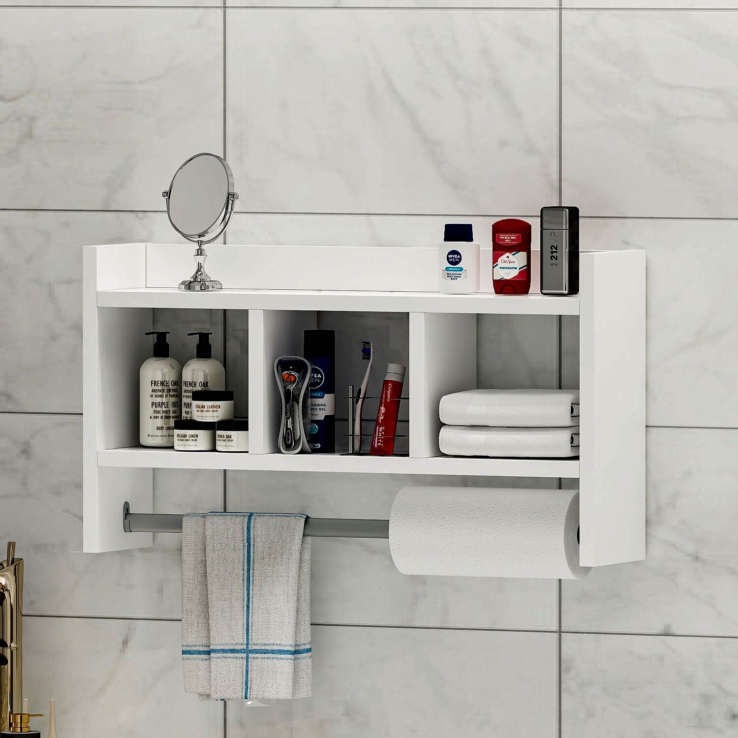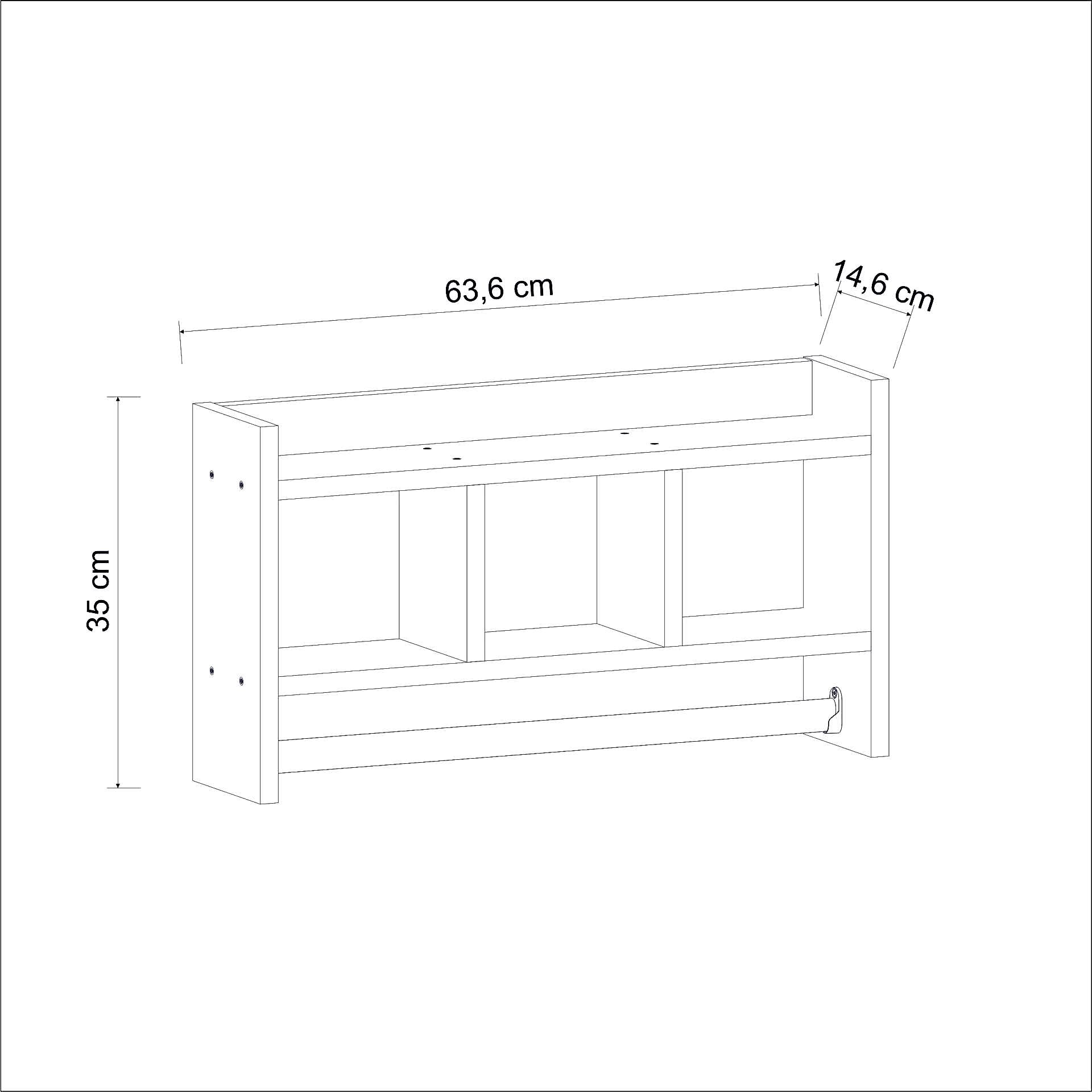 Üst kısmında ekstra raf yüzeyi, orta bölümde 3 adet geniş bölme ve alt kısmında hem havlu hem de kağıt havlu/peçete askılığı bulunmaktadır.