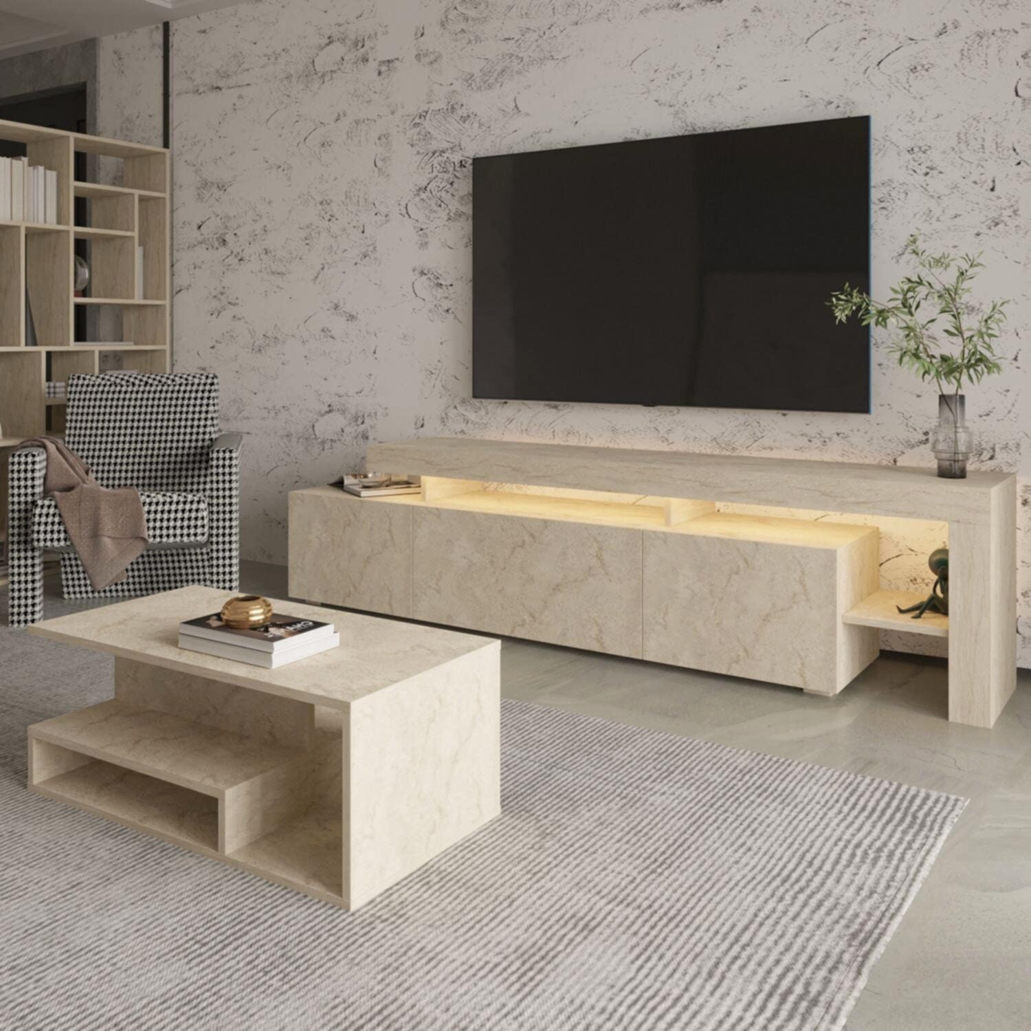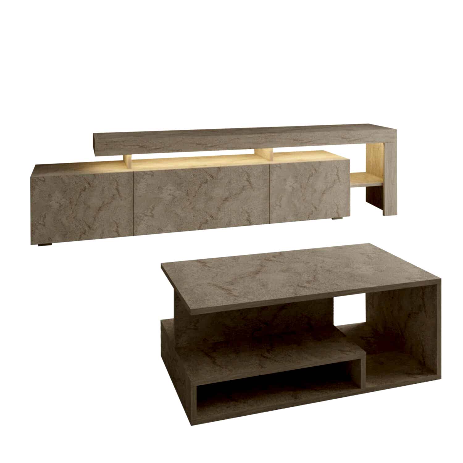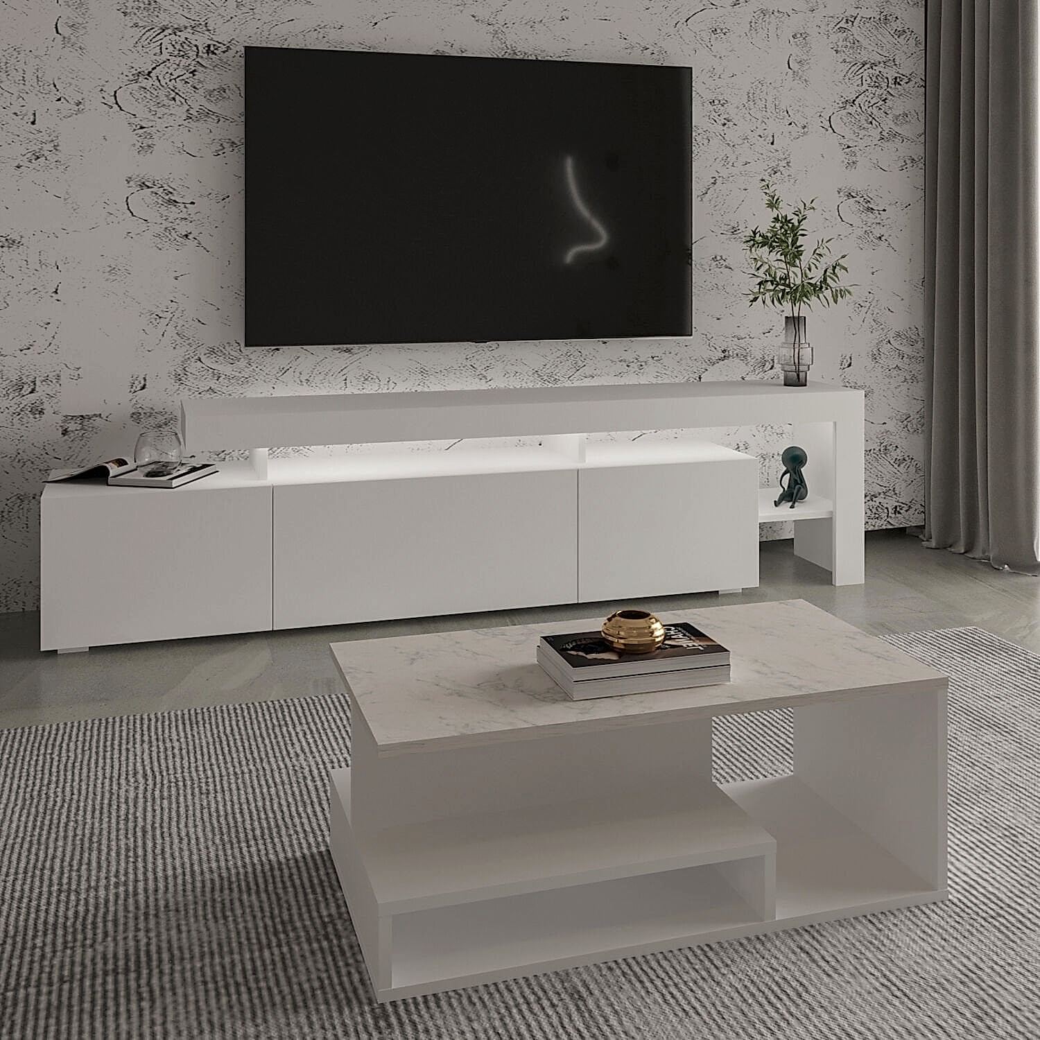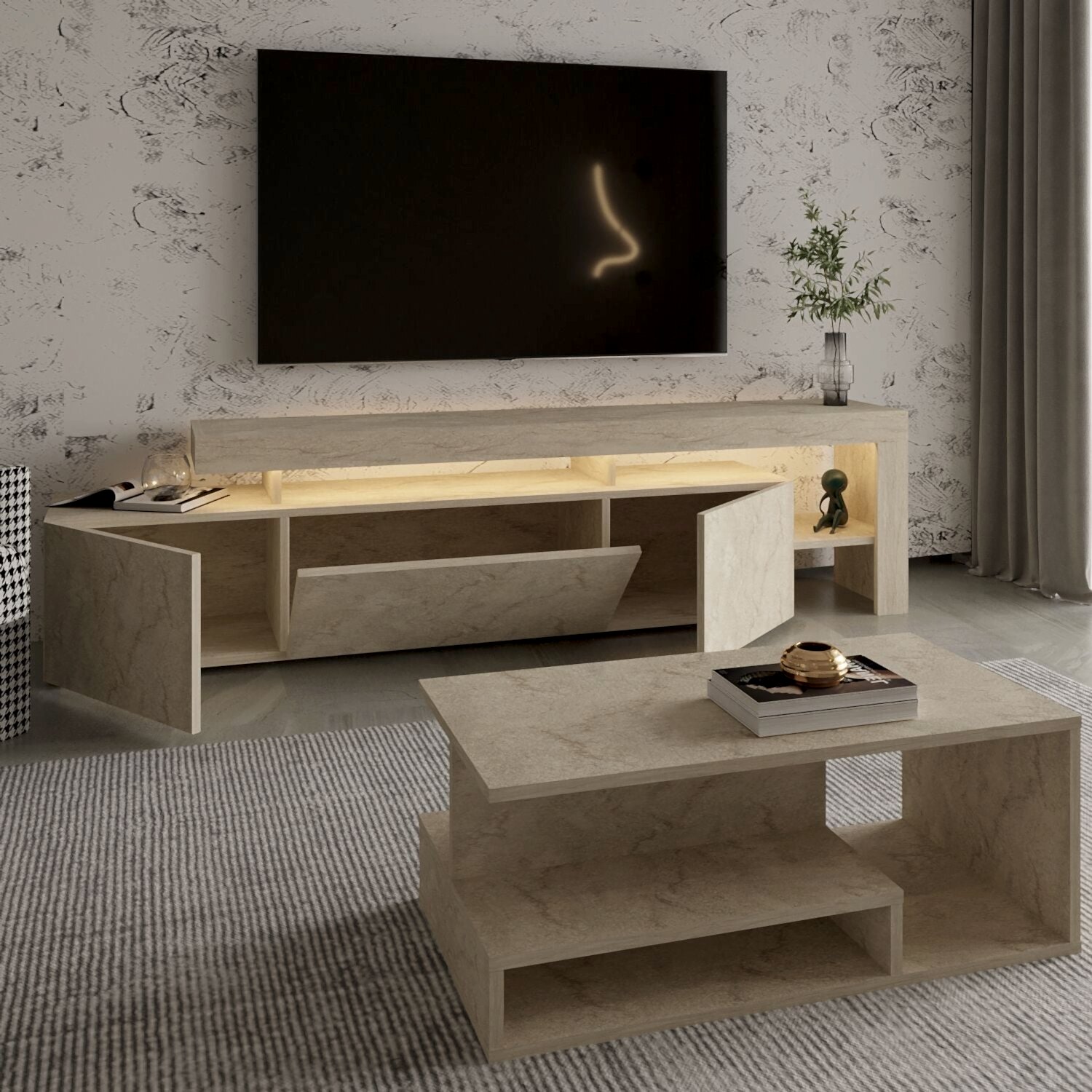 Bu set, hem estetik hem de fonksiyonel yapısıyla salonunuza modern bir atmosfer kazandırır. LED ışıklar sayesinde akşamları sıcak ve şık bir ambiyans yaratır. Orta sehpa ise açık raflı tasarımıyla dekoratif düzenlemeler için ideal bir kullanım sunar.