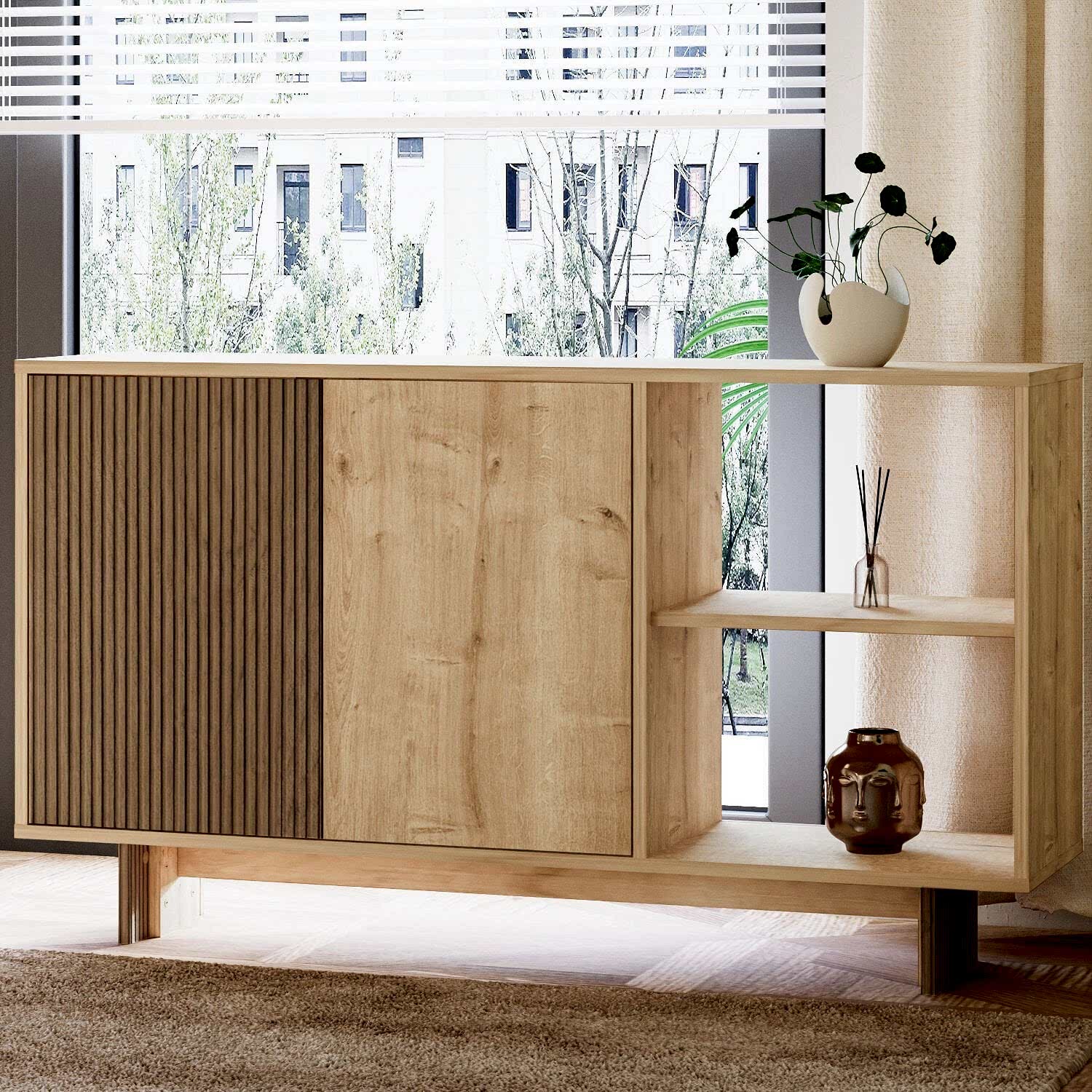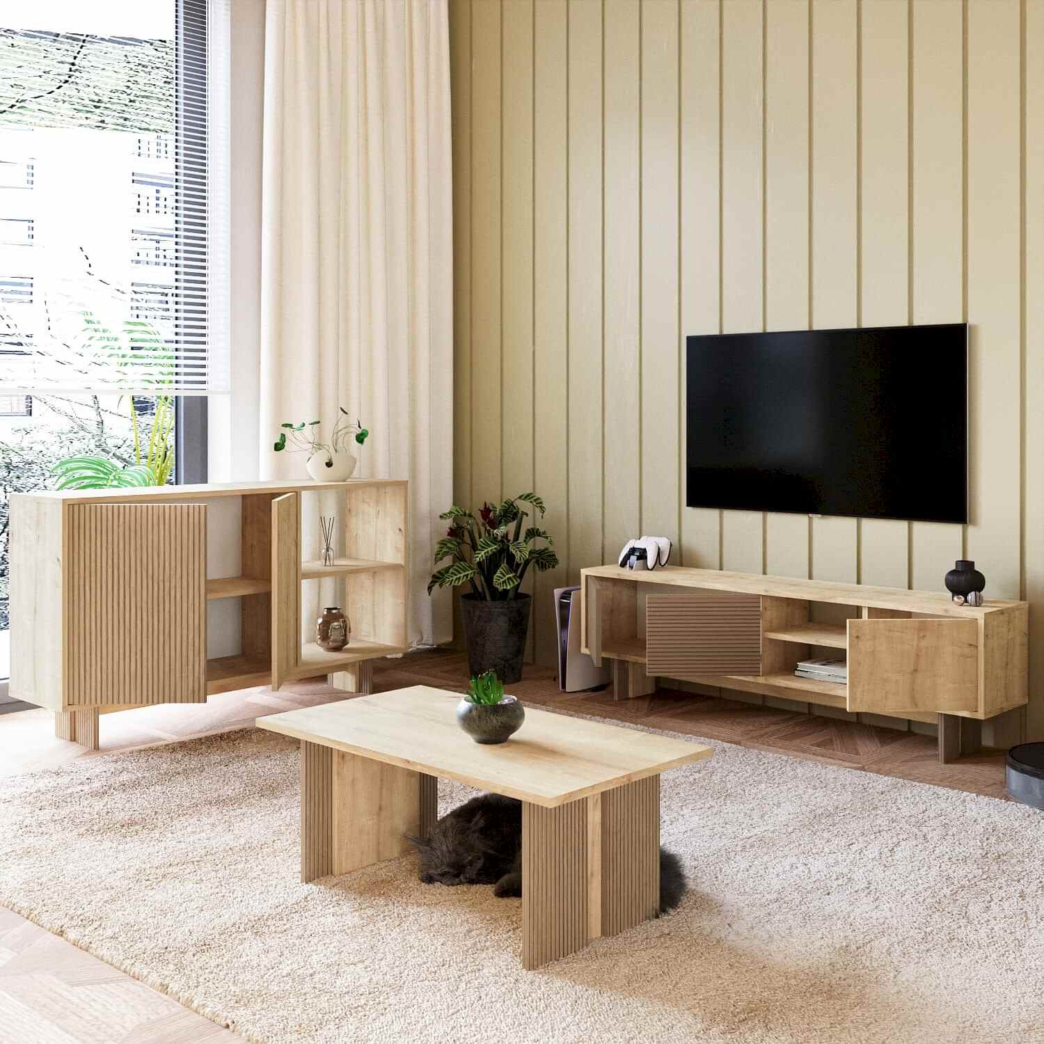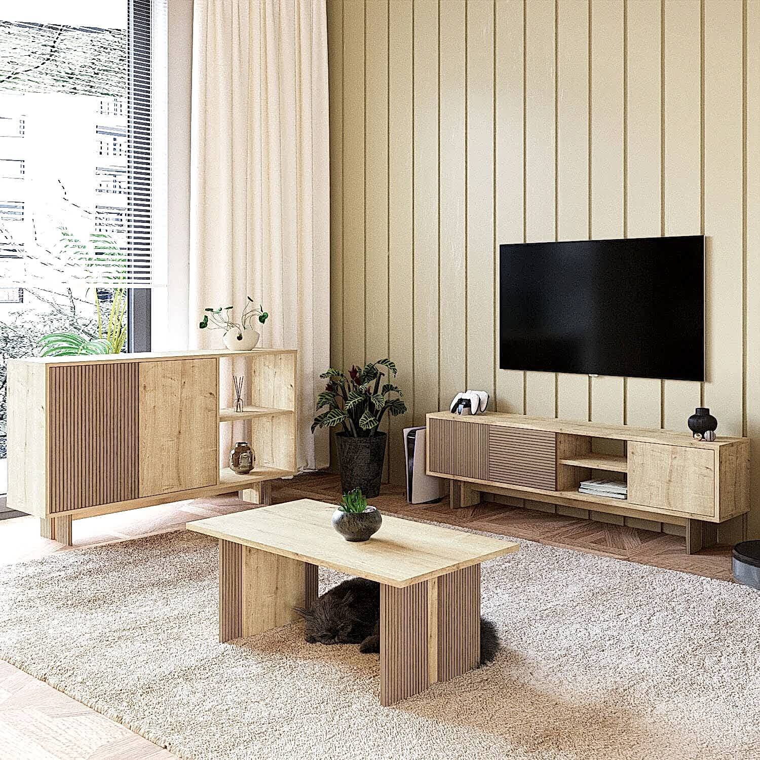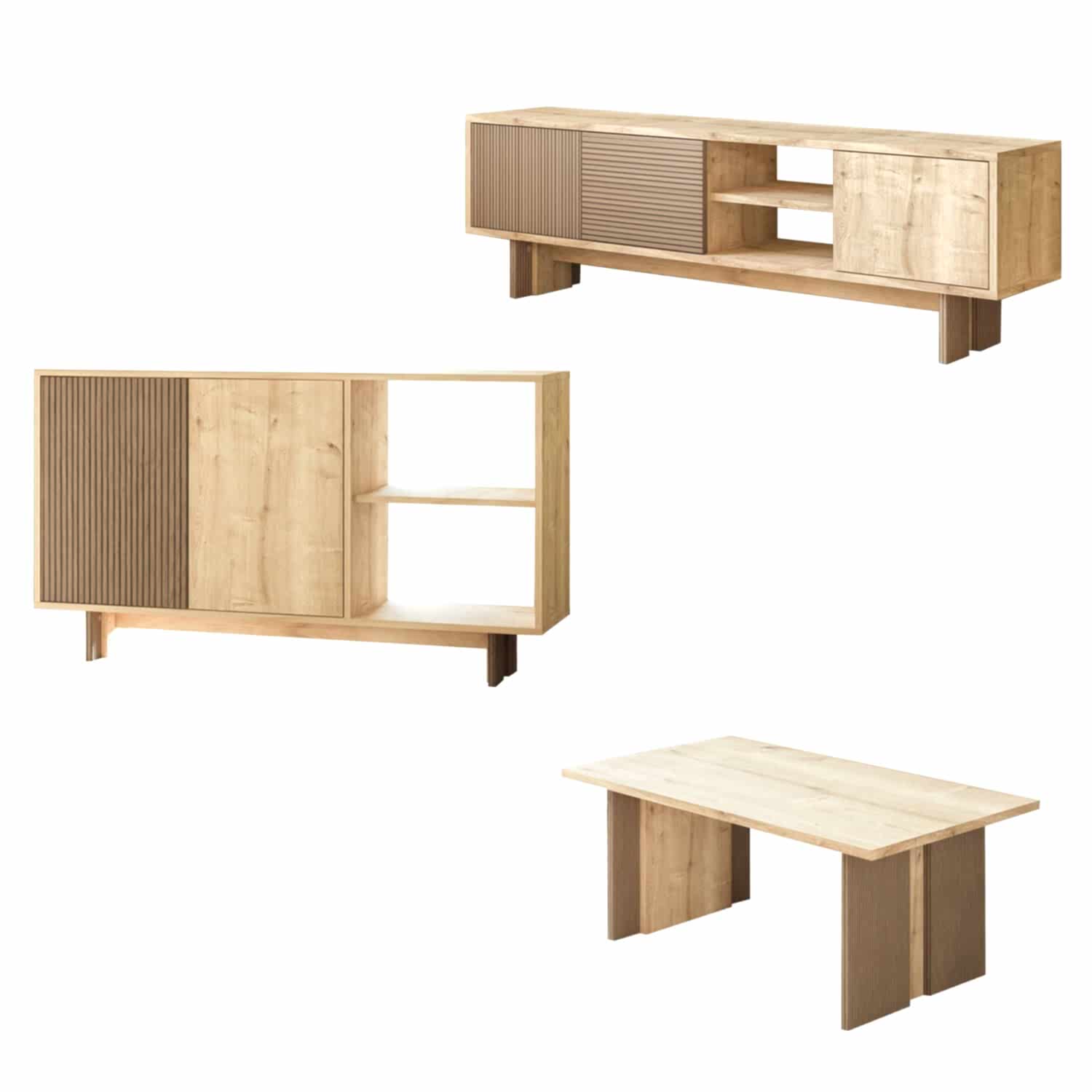 Ravello Oturma Odası Set, modern çizgileri ve fonksiyonel tasarımıyla yaşam alanlarınıza şıklık ve uyum kazandırır. Set; 2 kapaklı ve 2 geniş açık raflı konsol, 3 kapaklı TV sehpası ve minimalist orta sehpadan oluşmaktadır. Hem depolama hem de dekoratif kullanım imkanı sunan bu set, oturma odanızda bütünlük ve estetik sağlar.