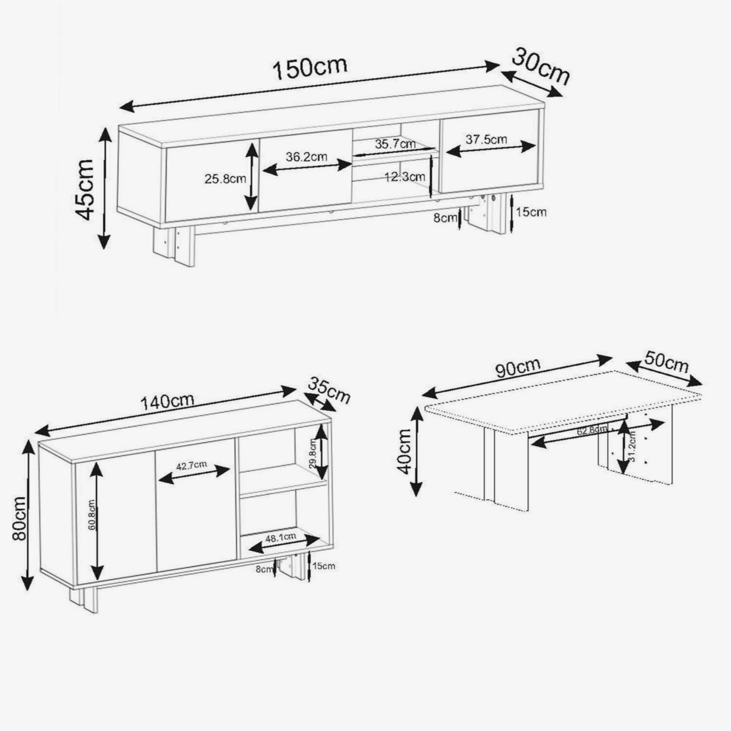 - TV Sehpası: 150 cm (genişlik) × 30 cm (derinlik) × 45 cm (yükseklik)