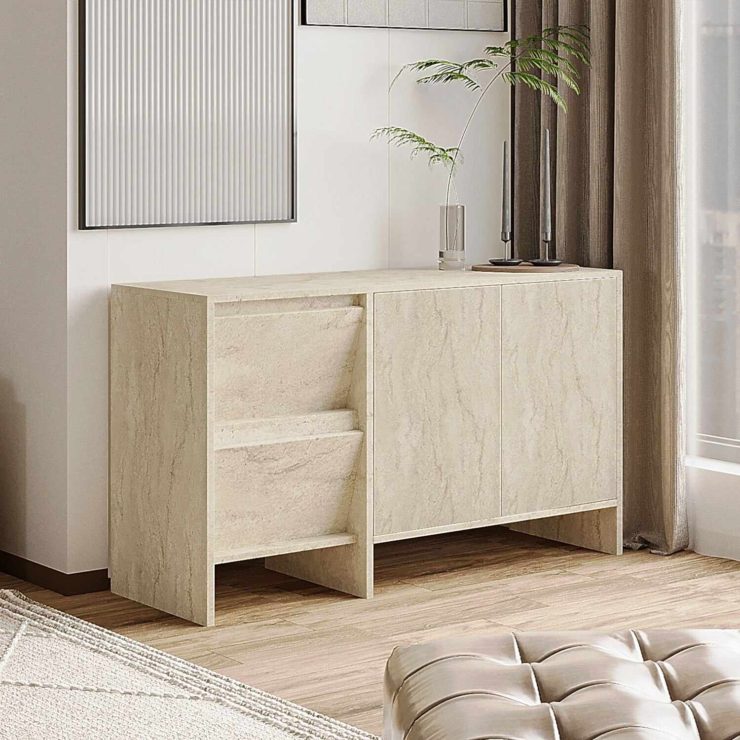 Laris 130 cm Konsol, modern yaşam alanlarına sade ve şık bir dokunuş katmak isteyenler için tasarlandı. Minimalist çizgileri, yüksek ayaklı yapısı ve 4 kapaklı geniş depolama alanıyla hem estetik hem de fonksiyonel bir çözüm sunar. Traverten, ceviz, beyaz, antrasit ve siyah olmak üzere 5 farklı renk seçeneğiyle her dekorasyona uyum sağlar.