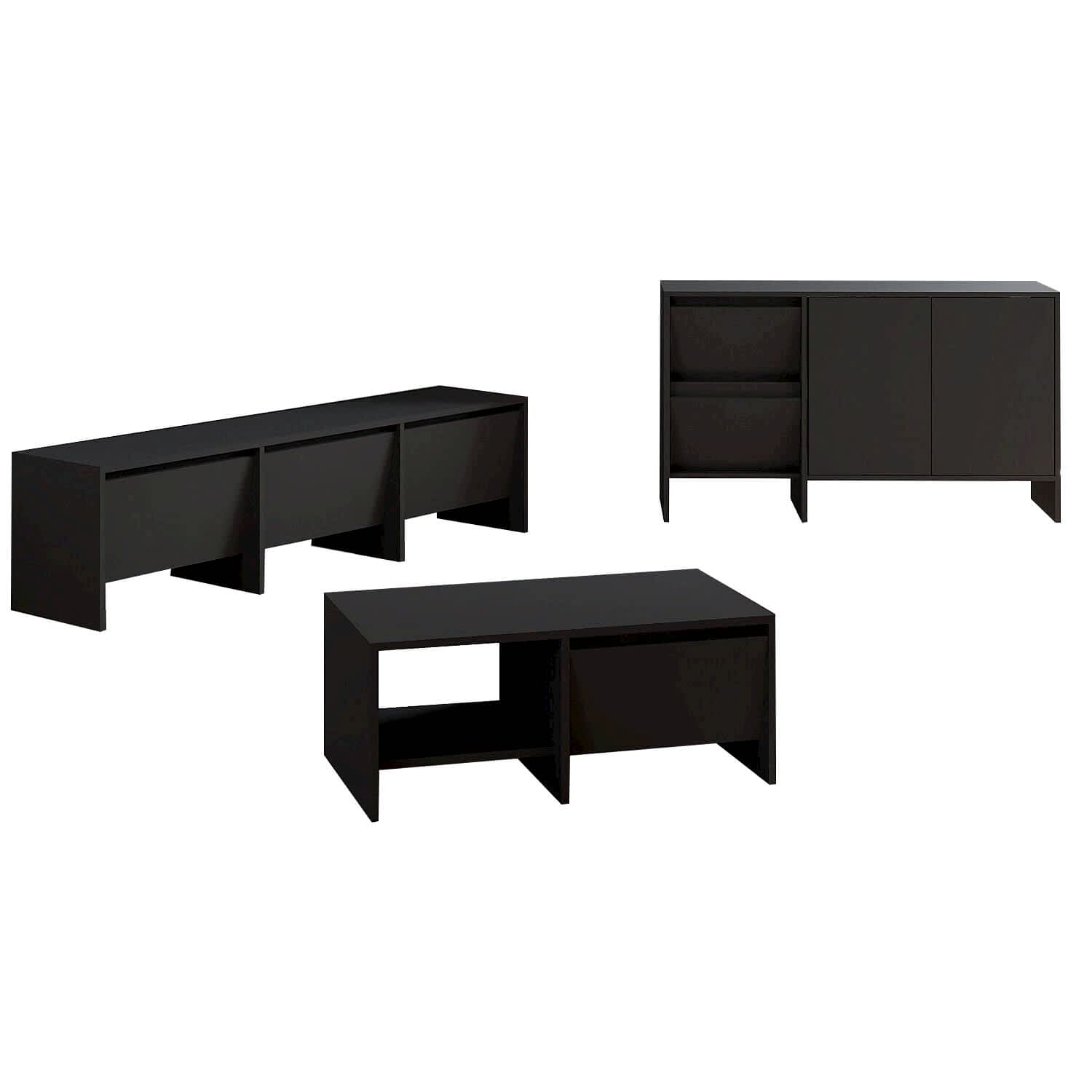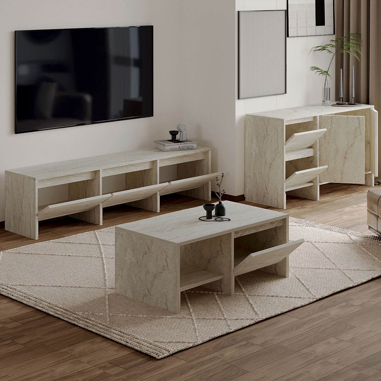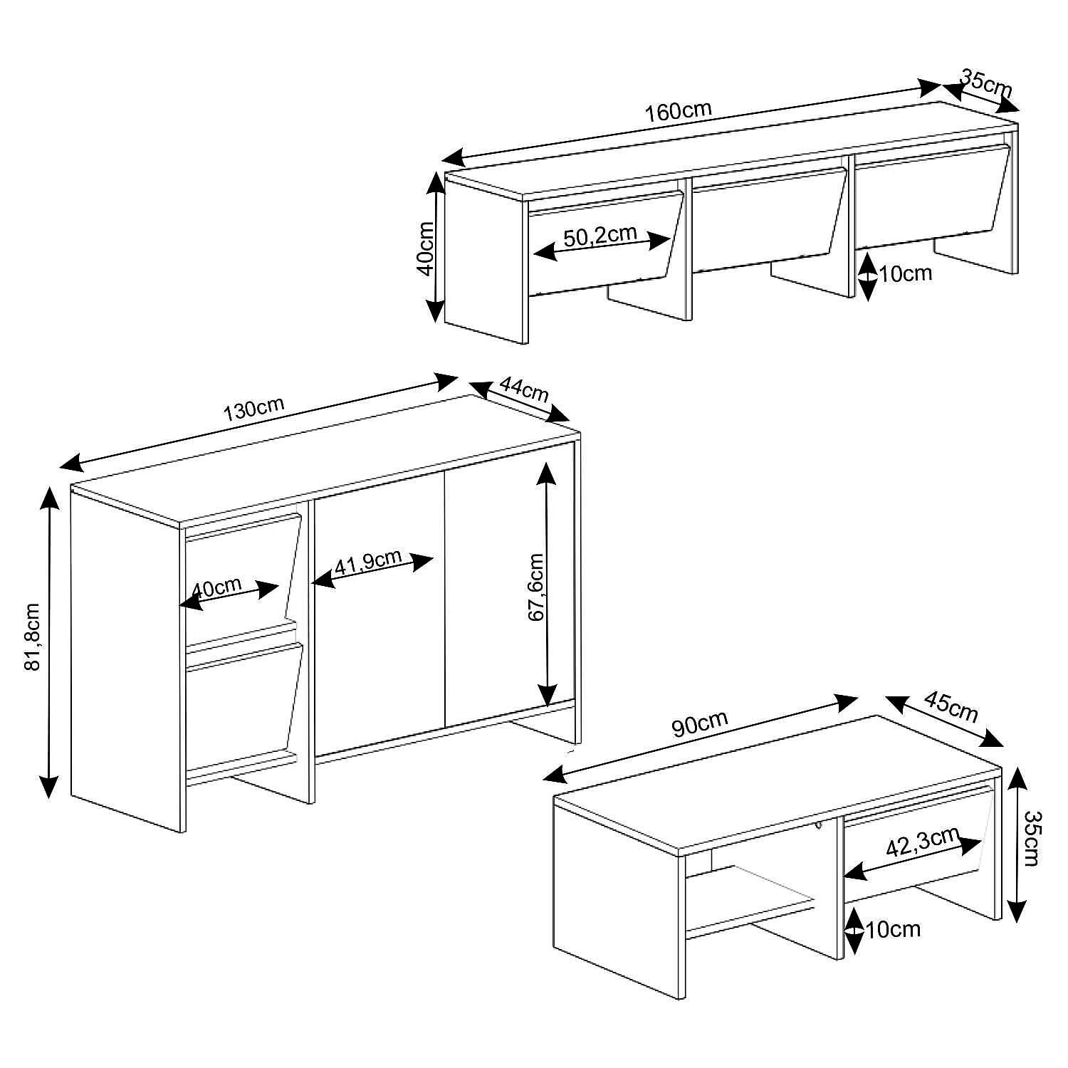 Laris Üçlü Set, modern yaşam alanları için estetik ve işlevselliği bir araya getiriyor. Set içerisinde yer alan 160 cm TV sehpası, 130 cm konsol ve 90 cm orta sehpa; sade çizgileri, dokulu yüzeyleri ve kapaklı depolama alanlarıyla hem dekoratif hem de kullanışlı bir çözüm sunar.
