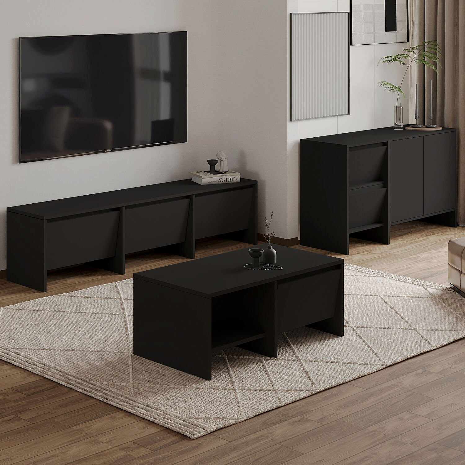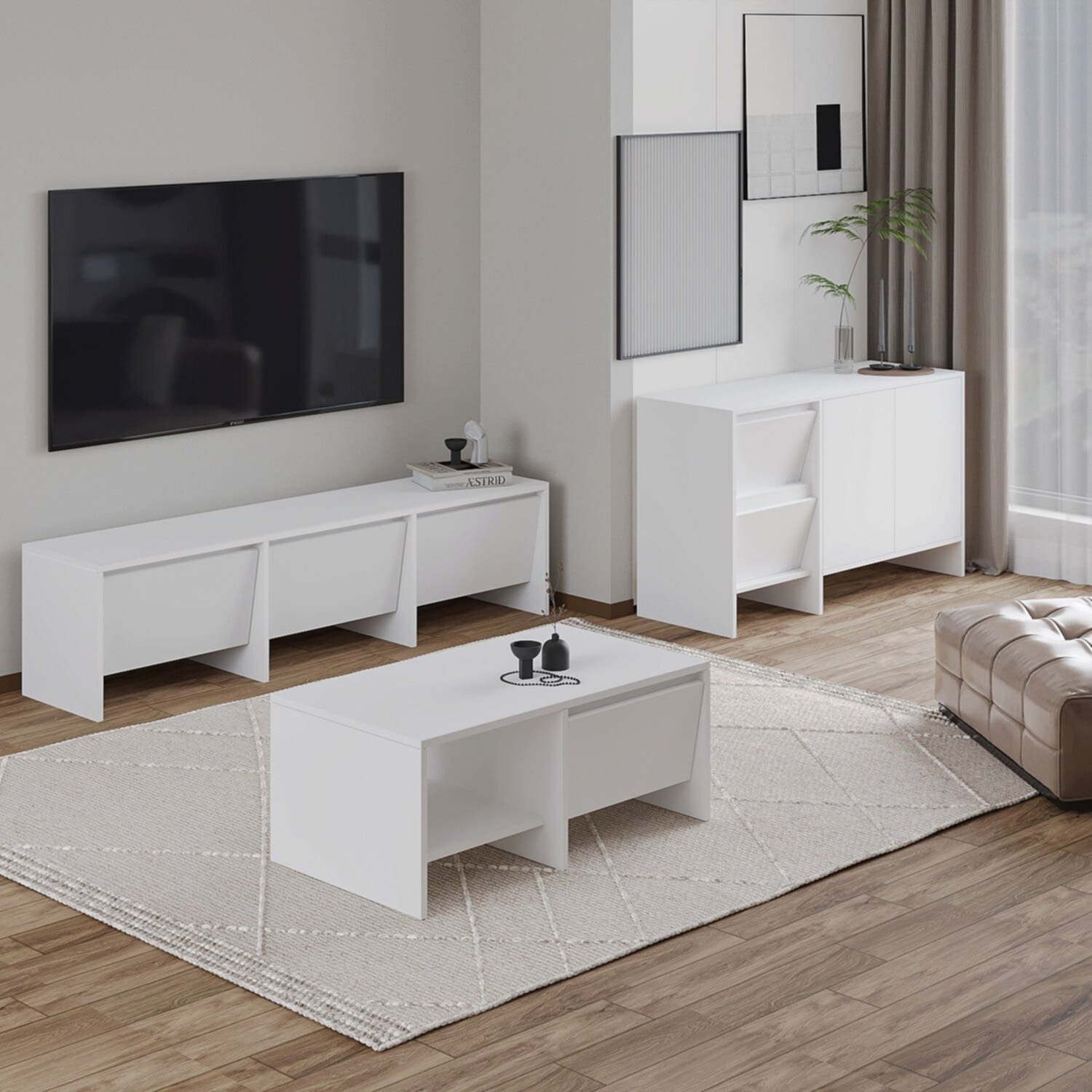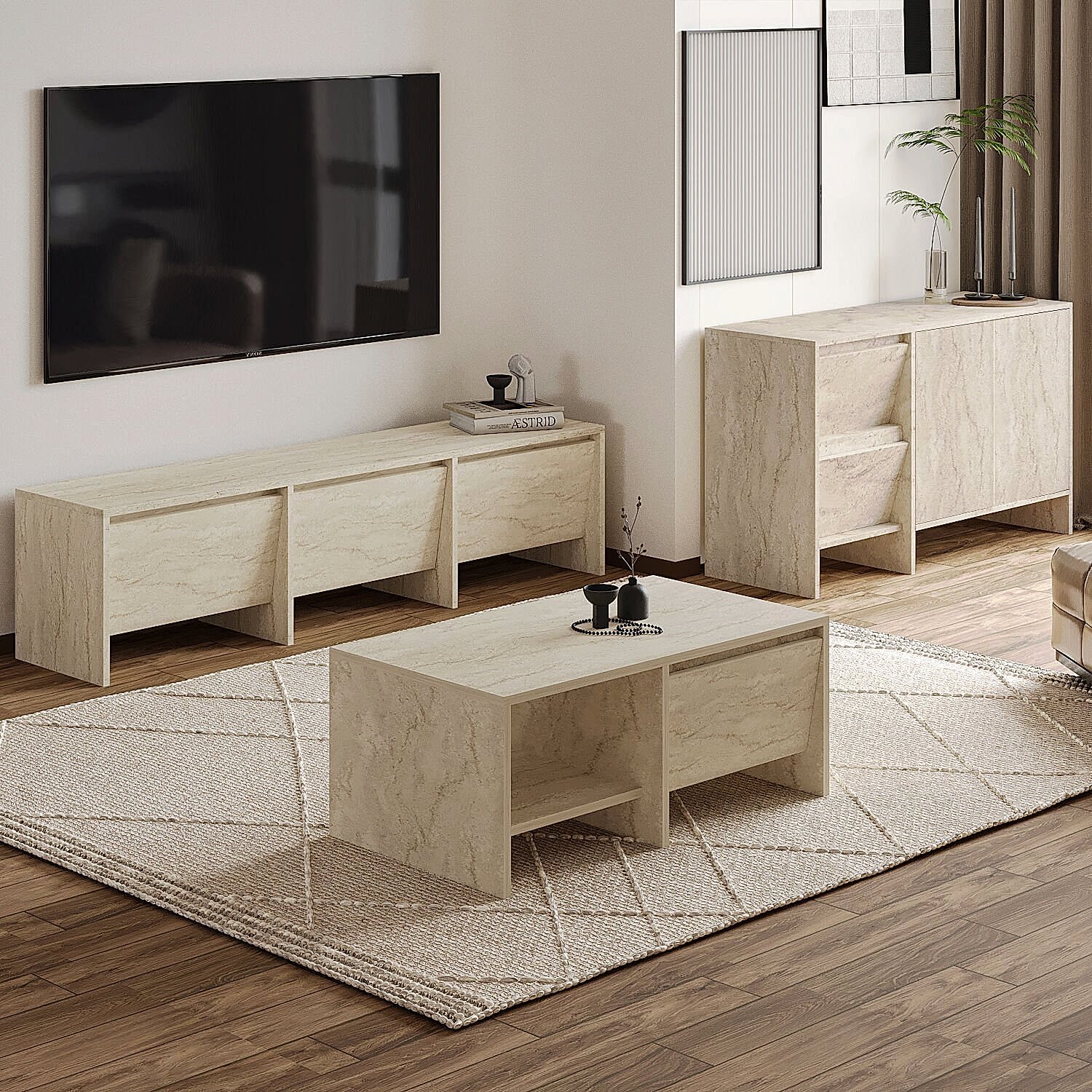 Laris Üçlü Set, modern yaşam alanları için estetik ve işlevselliği bir araya getiriyor. Set içerisinde yer alan 160 cm TV sehpası, 130 cm konsol ve 90 cm orta sehpa; sade çizgileri, dokulu yüzeyleri ve kapaklı depolama alanlarıyla hem dekoratif hem de kullanışlı bir çözüm sunar.