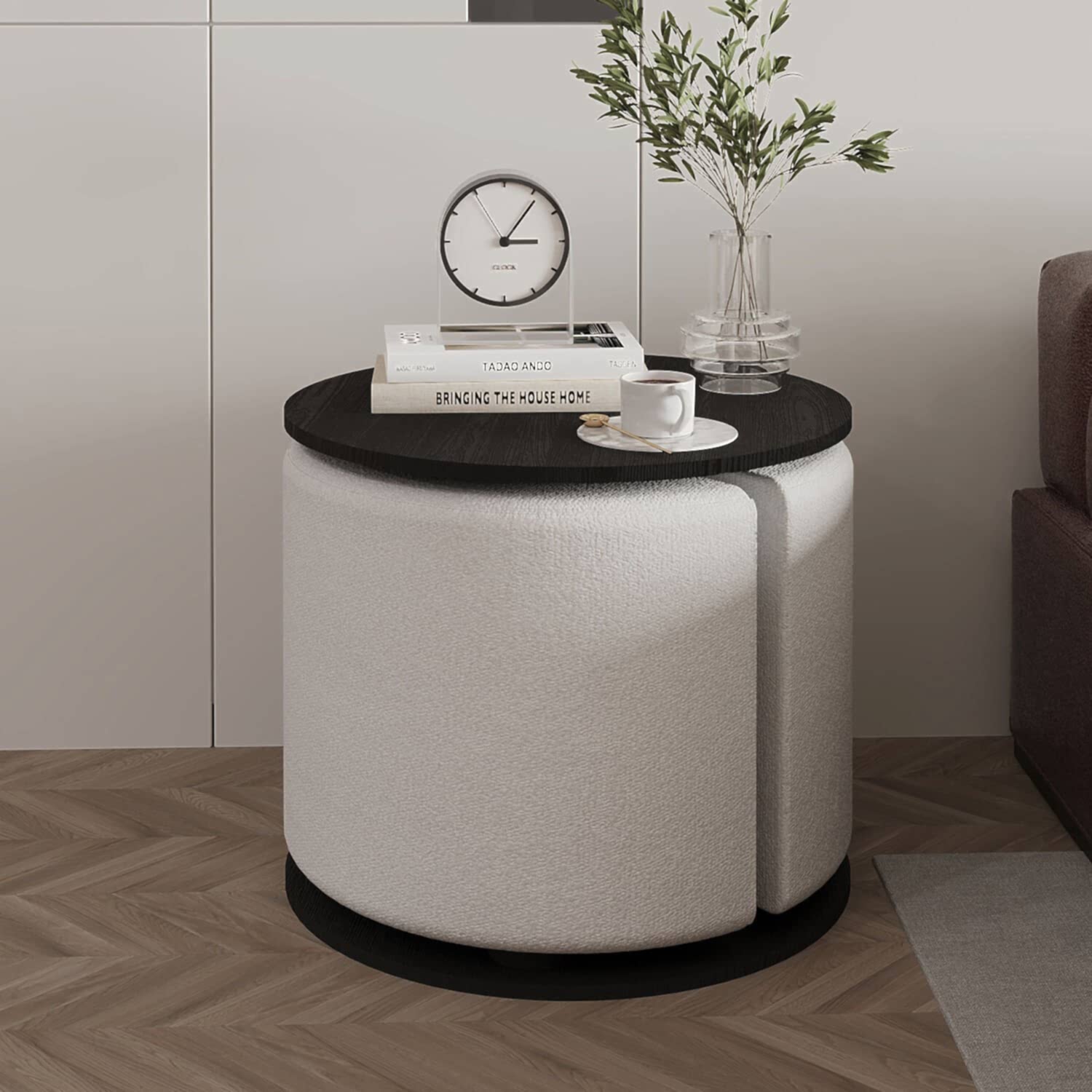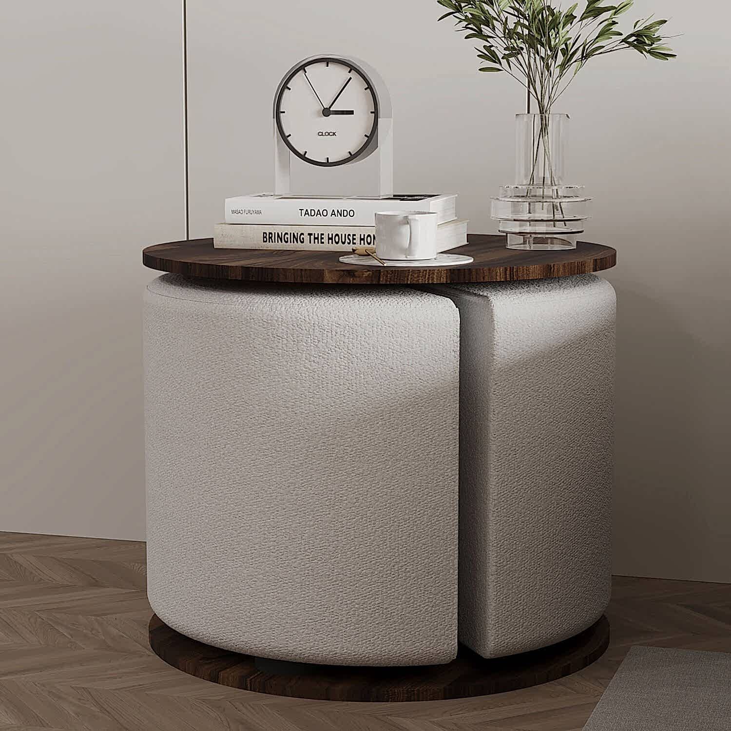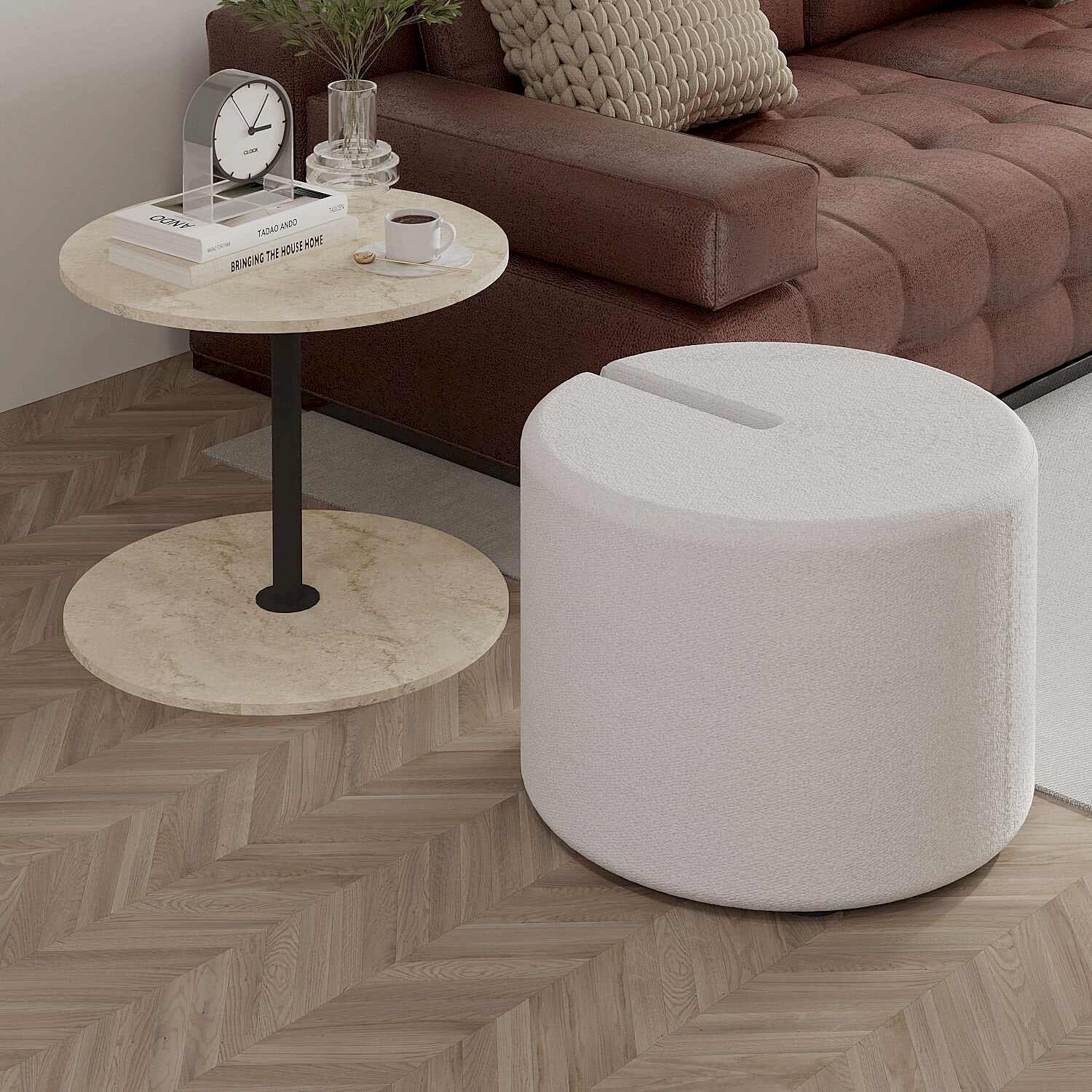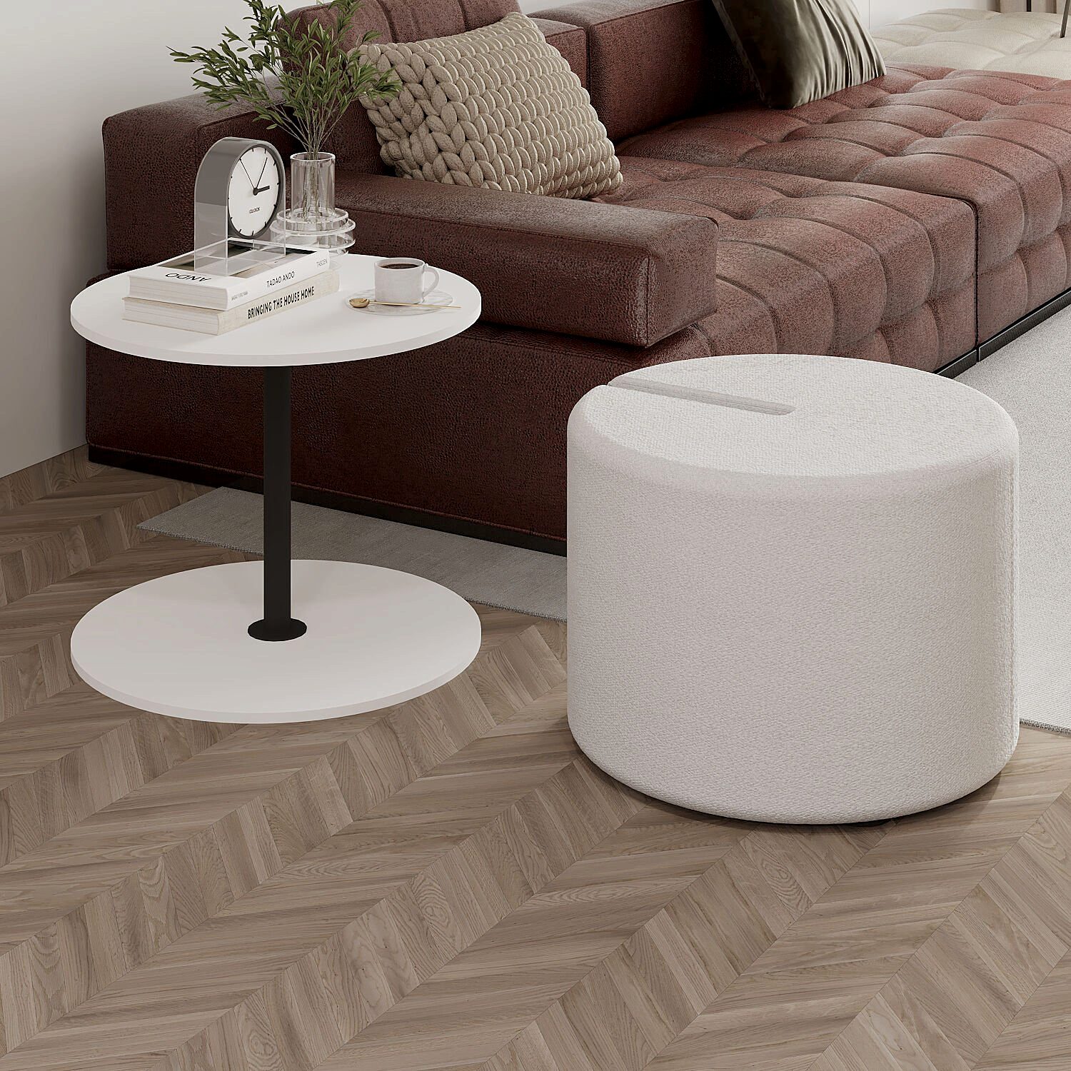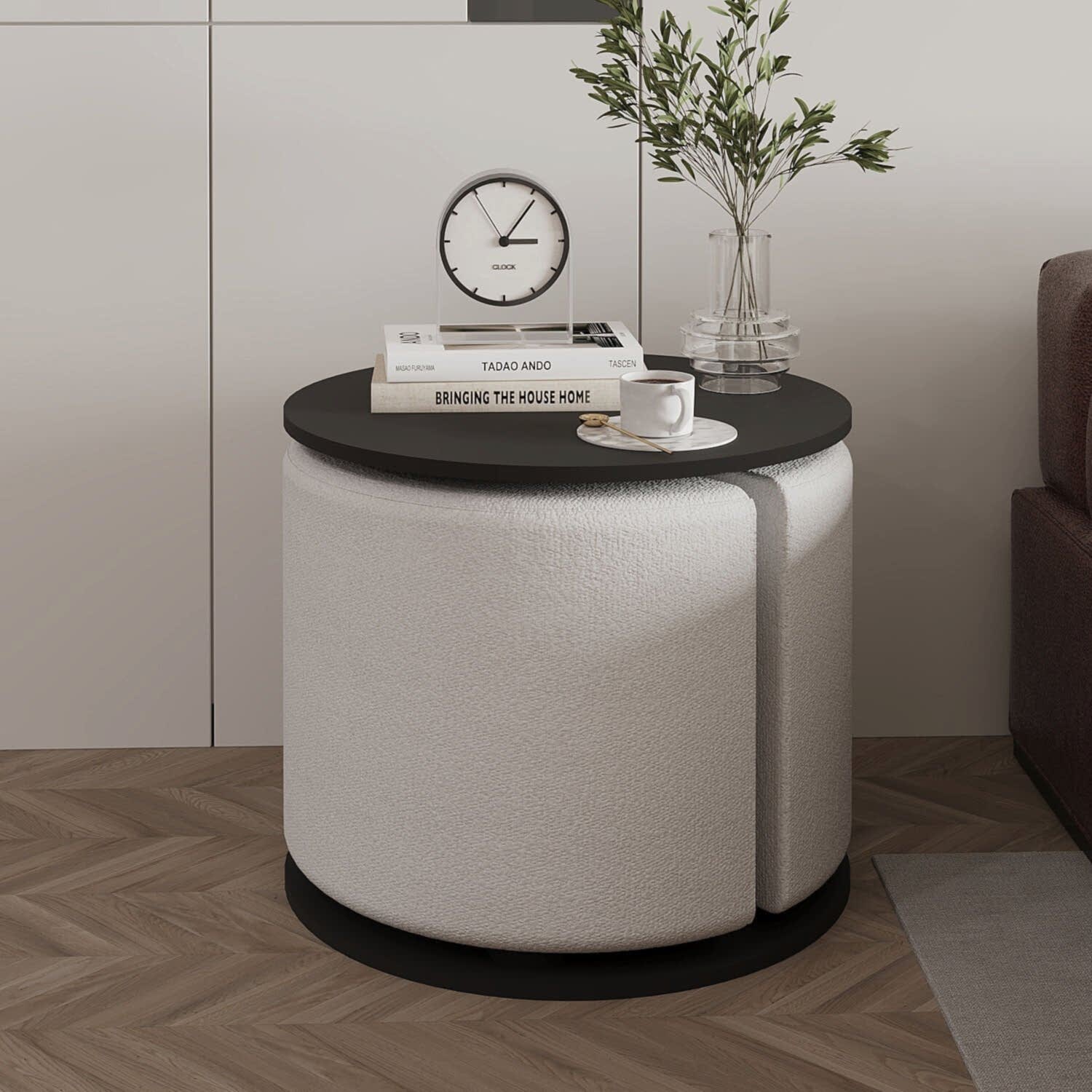 Modern yaşam alanları için hem şık hem de fonksiyonel bir çözüm sunan Vexana Puflu Yan Sehpa, saklanabilir pufu ve geniş servis alanıyla dikkat çeker. Orta destek kısmı siyah renkli metalden üretilmiş olup, sağlamlık ve estetik bir görünüm sunar. Krem renkli pufu, oturma alanı olarak kullanılabilirken, gerektiğinde kolayca sehpaya entegre edilebilir. Üst tabla ise Ahşap Siyah, Antrasit, Ceviz, Traverten Desen ve Beyaz olmak üzere 5 farklı renk seçeneğiyle sunulmaktadır.